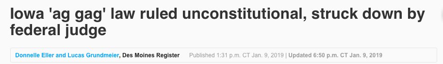 Ag Gag Law Struck Down in Iowa– We have been involved in a lawsuit against the state of Iowa since 2017 in order to overturn the Ag Gag law because it infringes on our first amendment right. We were thrilled when we won the suit in January of this year, however the state of Iowa rushed to pass a nearly identical law in order to give special protection the animal production industry. Alongside the ACLU and ALDF, as well as other plaintiffs, we filed a second lawsuit against Ag Gag 2.0 and were thrilled when the Iowa courts announced that Ag Gag laws couldn’t be enforced while the lawsuits are ongoing. This is a huge win for the animal in Iowa, who will no longer be invisible within puppy mills and other animal agricultural facilities.