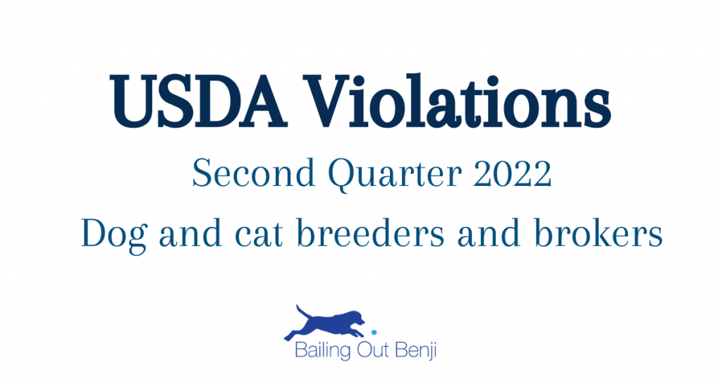 According to the USDA: An inspection report documents an inspector’s observations and professional assessments of compliance at facilities regulated under the AWA. Below we have compiled a list of all of the USDA dog breeders and brokers that have had violations in Quarter 2 of 2022.