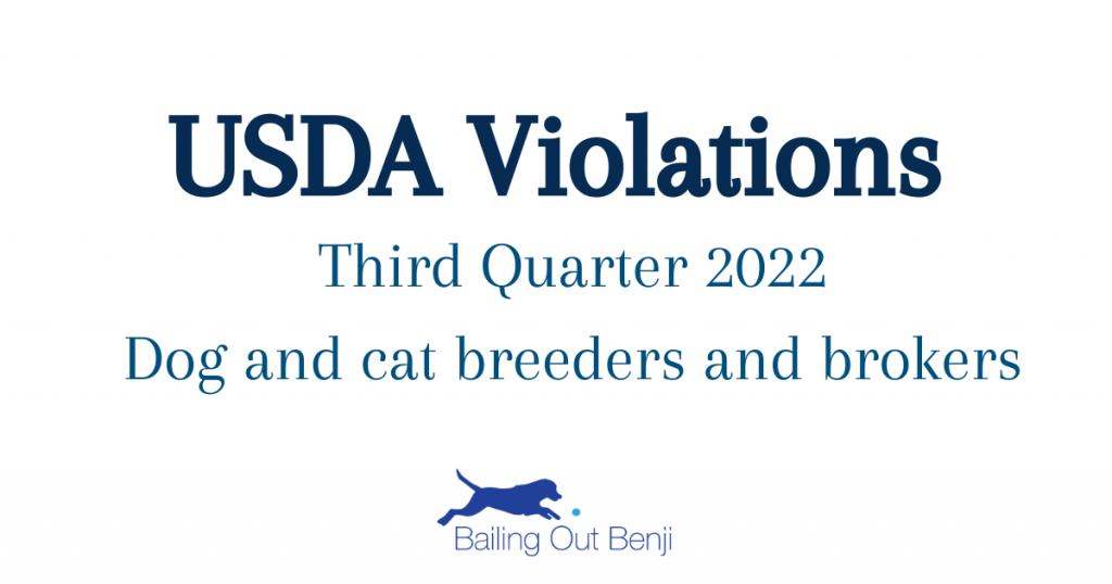 According to the USDA: An inspection report documents an inspector’s observations and professional assessments of compliance at facilities regulated under the AWA. Below we have compiled a list of all of the USDA dog breeders and brokers that have had violations in Quarter 3 of 2022.