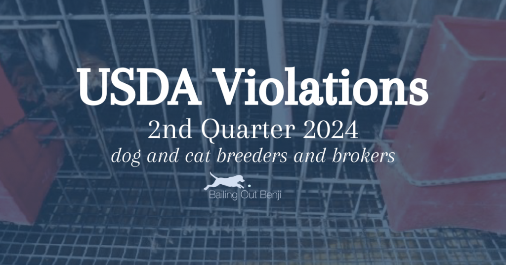 According to the USDA: An inspection report documents an inspector’s observations and professional assessments of compliance at facilities regulated under the AWA. Below we have compiled a list of all of the USDA dog breeders and brokers that have had violations in Quarter 2 of 2024.