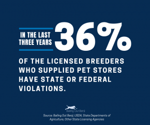 [36%] of the licensed breeders who supplied pet stores in the last three years had state or federal violations. This number is based on the sales data and inspection reports of the 1,946 dog breeders that are currently selling to pet stores. Reflected separately from this data is reporting on breeders who supply brokers who then resell to pet stores.