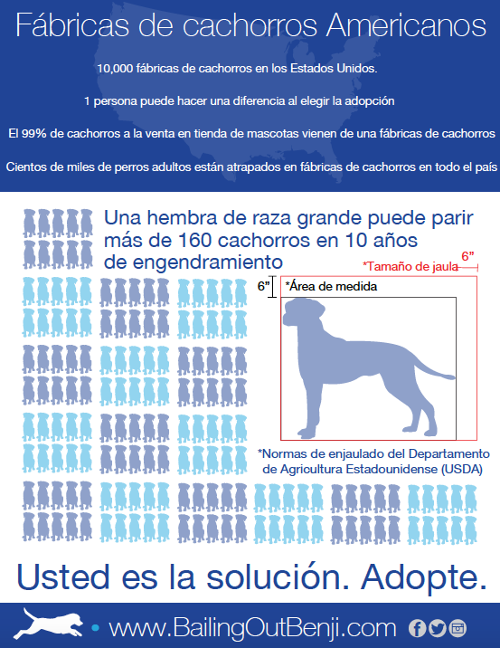 Miles de perros se mantienen en jaulas estrechas, con escasos cuidados mínimos y se crían hasta que sus cuerpos se dan por vencidos. Los cachorros nacidos en estas fábricas son to se mascotas para los criadores, si no solo una mercancía. Los cachorros son vendidos en el internet, en tiendas de mascotas, y muchas veces en los mercados de pulgas y los compradores nunca ven las condiciones en las que fueron criados. Ayúdenos a poner fin a esta práctica cruel y barbarica .
