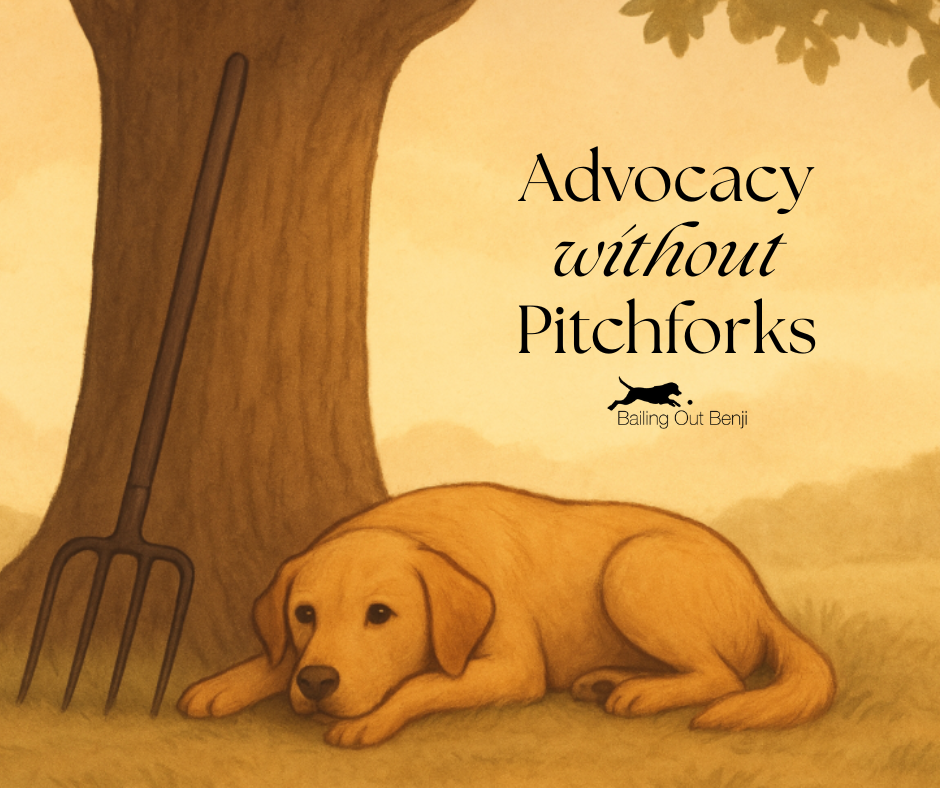 Advocacy without pitchforks means focusing on the mission, not the fight. It means understanding that there are people in the industry who love dogs too and also don’t want to see them suffering. When we meet people where they are, instead of where we wish they were, we create space for growth on both sides.