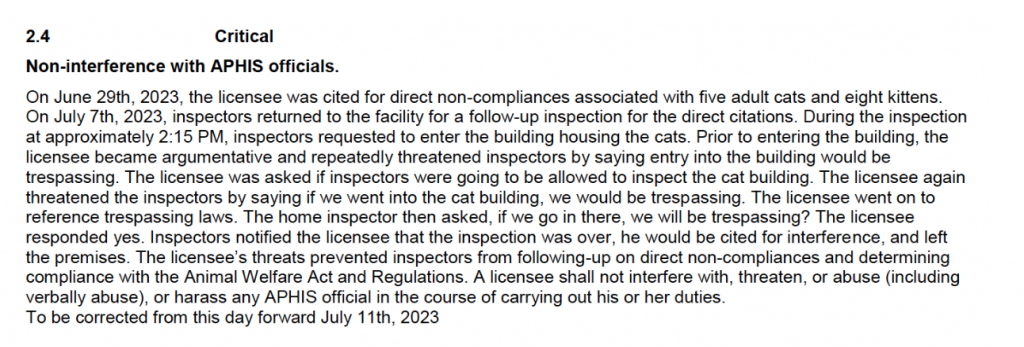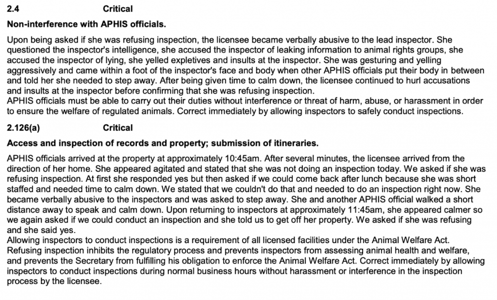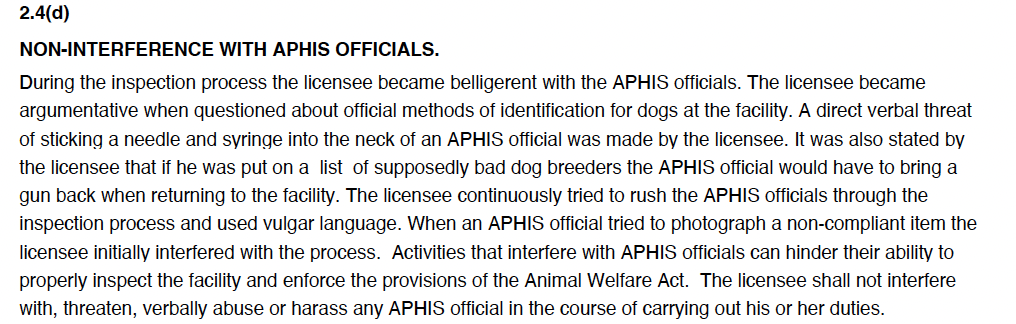 As you can see, it can be volatile and sometimes downright dangerous for the USDA inspectors to be overseeing these properties. They are walking onto someone’s property, sometimes inside of a person’s home, and they are expected to document AWA violations. Unfortunately, threats to an inspector do not result in an automatic revocation of a license.