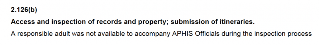 There are many documented instances where a USDA licensee refuses to allow the inspector access to the property or behaves in an unsafe way where the inspection must end. The licensee receives a ‘critical’ violation for refusing to allow an inspection to occur or continue. The USDA, as seen in the image below, suggests that the inspector leaves the premises and calls the police.