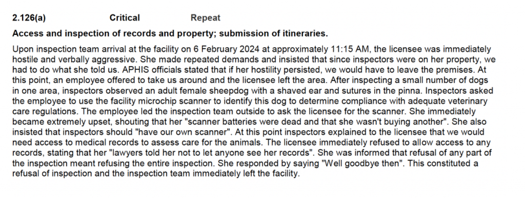At least 13 times between January 1st, 2023 to February 29, 2024, USDA licensees received a Critical Violation for refusing inspectors to have access to their property. In certain cases, licensees were argumentative and belligerent towards inspectors.