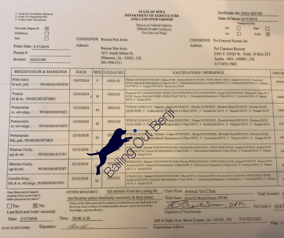 We also have records that show the Rothman’s business “Pet Connect Rescue” is sourcing their puppies from another sham rescue operation called Rescue Pets Iowa , who is involved in not just one but two lawsuits in what is now being referred to as a “National Puppy Laundering Scheme”. And, as you can see below, the veterinarian signing off on the health certificates coming from “Rescue Pets Iowa” is one of the horrible hundred puppy mills.