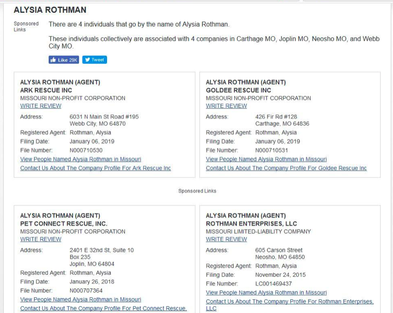 “Pet Rescue Connect”… “Pet Connect Rescue” or is it “Ark Rescue” … Or is it “Goldee Rescue” … Or their real business “Rothman Enterprises”. All of the addresses listed above, except for one, are PO Boxes in various cities, but all are owned by Alysia Rothman and her partner Ray Rothman.
