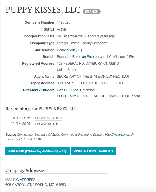 And lastly, we have records of where the Rothman-owned Connecticut pet store, Puppy Kisses, is sourcing their puppies from. You won’t be surprised to hear that many of those breeders have been named the worst puppy mills in the country and have a long list of violations.
