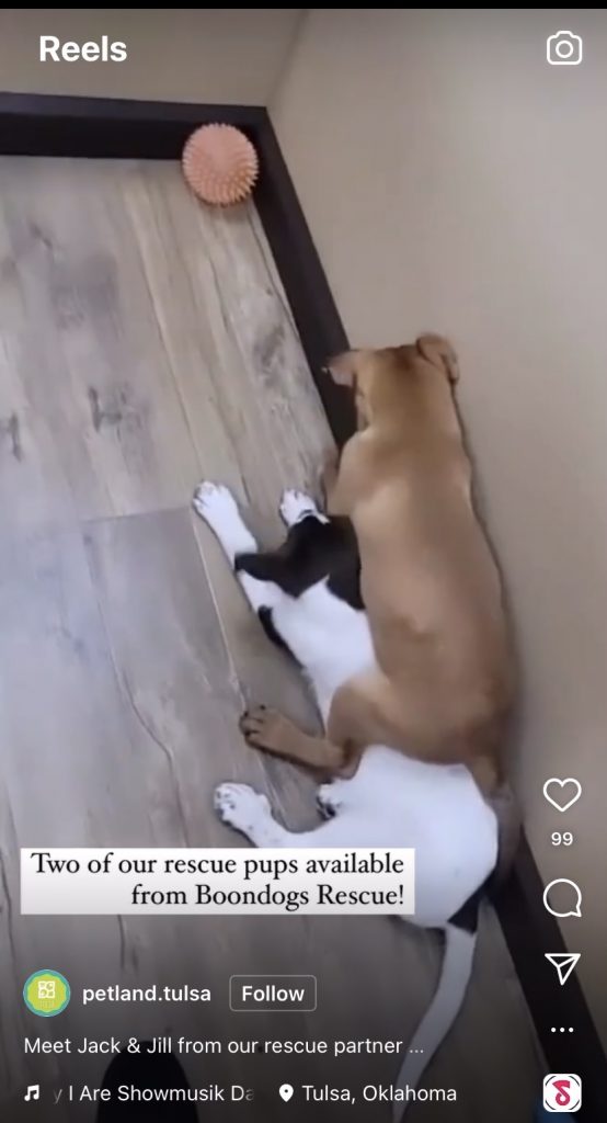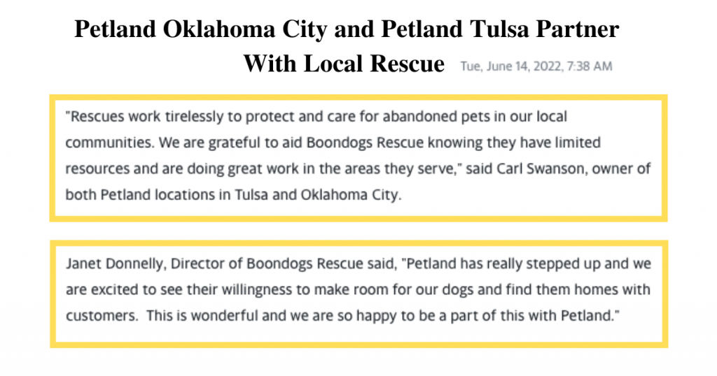On June 14, 2022 Petland put out a press release to announce that they “are excited to announce their new partnership with Oklahoma rescue, Boondogs Rescue, to support local adoptions.” To be clear, Petland would still be offering commercially bred puppies for sale but, according to this press release, they will now be offering space to a local rescue.