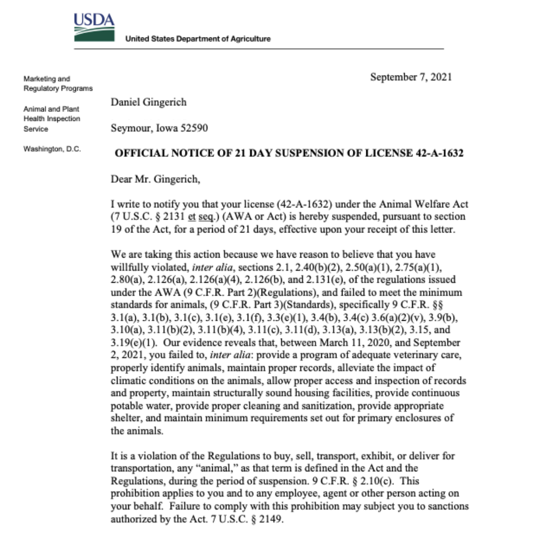 In September 2021, Daniel Gingerich’s license was suspended for 21 days. By November 2021, Daniel Gingerich had been sued by the USDA and Department of Justice and had more than 500 animals rescued off of his property.