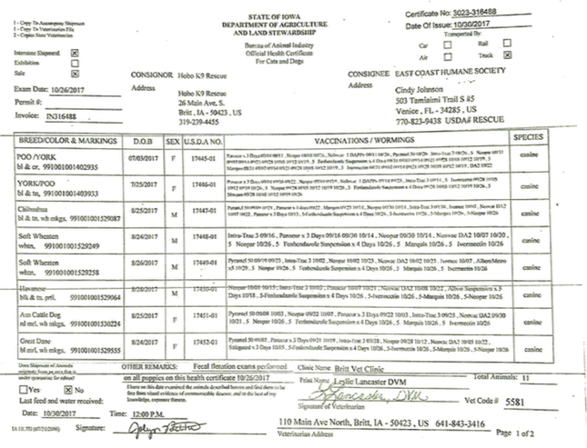East Coast Humane Society, 503 Tamiaimi Trail, Venice, FL 34285 . We reached out to the director of ECHS, Cindy Johnson, and she never returned our emails. As you can see, in this CVI data, the box marked “sale” was checked off, implying that money exchanged hands for the purchase of these puppies.