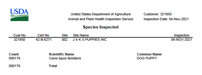 In this case, we have requested Certificates of Veterinary Inspection (CVIs), on notorious dog broker, JAKS Puppies. JAKS Puppies is based out of Britt, Iowa and not only sells to pet stores all over the country, but they started one of the nation’s first sham rescue operations. Because of their role in this, JAKS was investigated by the Iowa Attorney General due to puppy laundering and they are linked to other sham rescue organizations that have been sued in the state of California.