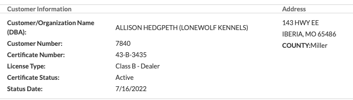 Mother Dog Rescue AKA Dog Mother Rescue Society located in Iberia, Missouri is no stranger to the sham rescue world. They have been connected to the sham rescue industry since 2018 when they were included in a Chicago Tribune expose and they continue to sell puppies to stores in cities and states that have legislation prohibiting that. Interestingly enough, Mother Dog Rescue is operated by Allison Hedgpeth, who also operates Lonewolf Kennels, a puppy brokering facility that has been recognized twice by the HSUS for being an example of one of the worst puppy mills in the country.