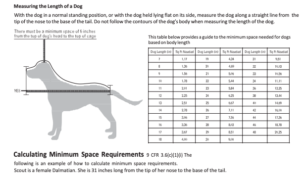 The minimum cage requirements of puppies or dogs in USDA facilities is 6 inches around the body. This image is from the USDA site.