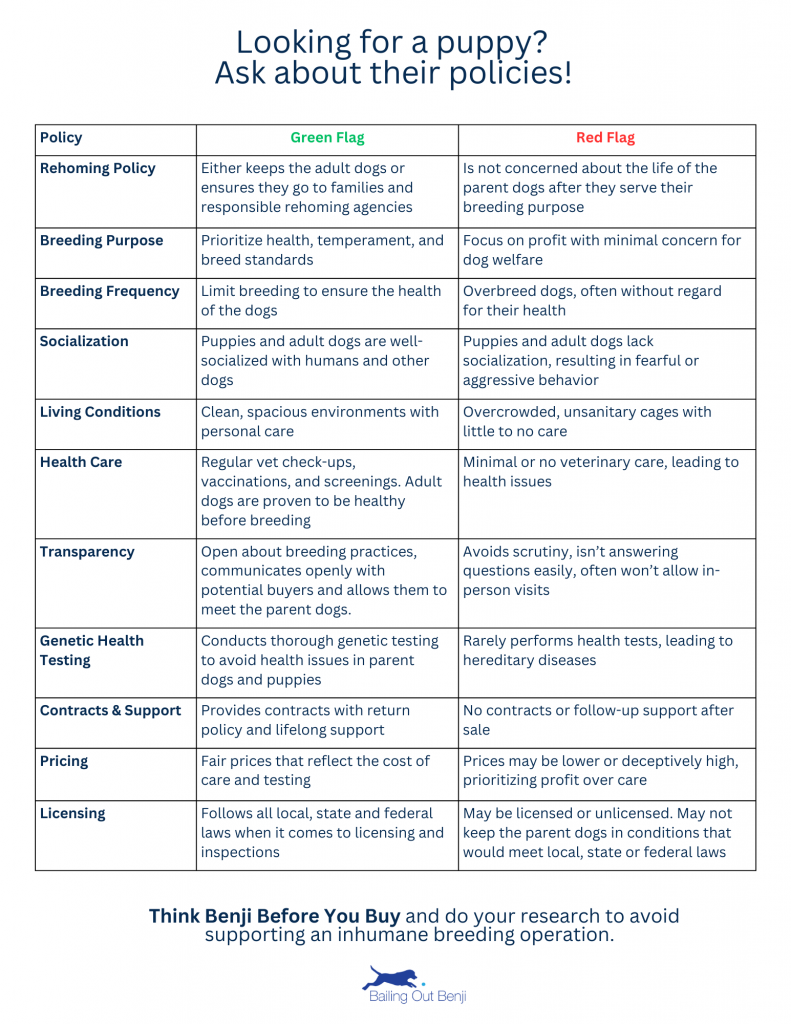However, when families are having a hard time finding an animal through a rescue or shelter, it is important for advocates to help make sure customers don’t accidentally support puppy mills as they continue their search. It is up to each and every one of us to help take the cruelty out of animal purchases, no matter how we personally feel about buying dogs or the intentional breeding of dogs.