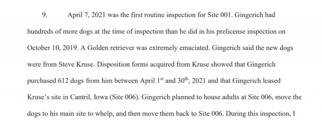 Even though this property and the active licensees keep getting horrendous violations, Steve Kruse is able to absolve himself from scrutiny. Daniel Gingerich was leasing Kruse’s property and had 600 of Kruse’s dogs, but Gingerich was the only person that was investigated by the USDA, the DOJ and the sheriff for the crimes that happened.