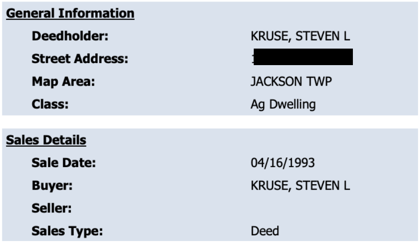 According to the Van Buren County Assessor’s page, Steve Kruse purchased this property in 1993 and has retained ownership since.