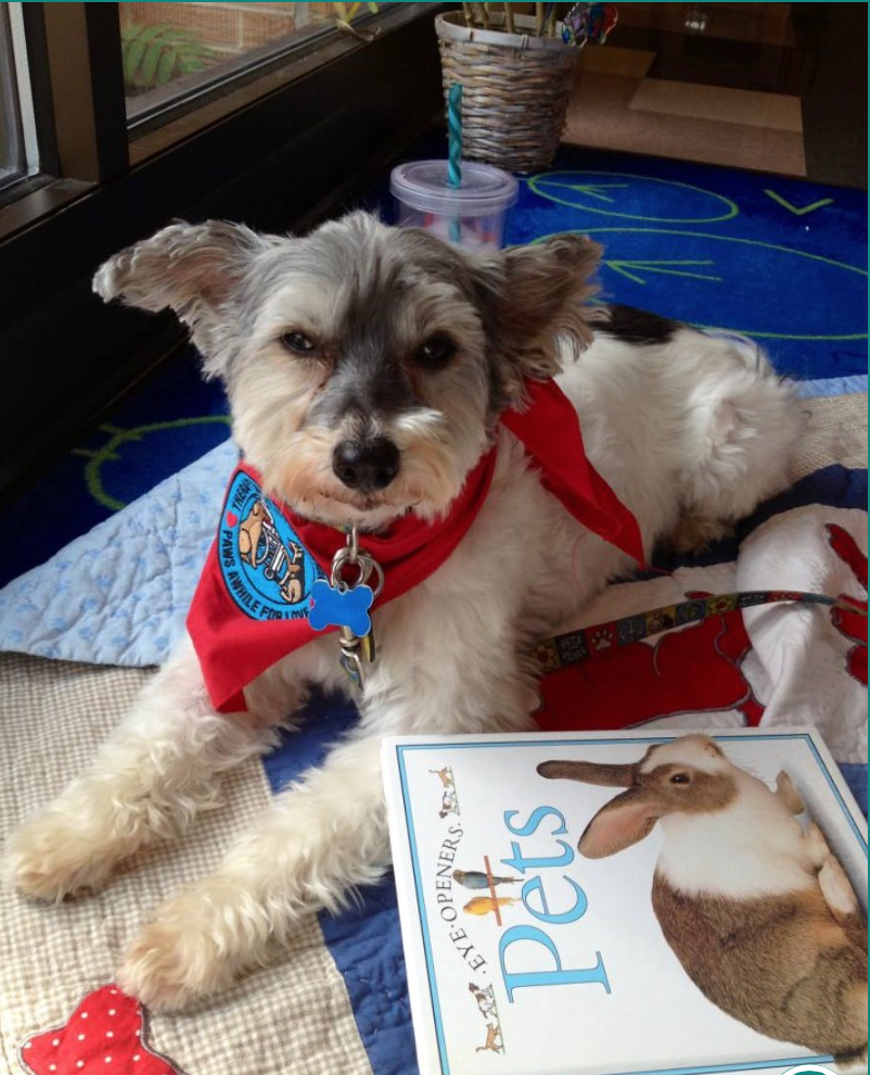 Maybe the biggest surprise was that eventually Thorp passed the test to be a certified Therapy Dog and the Canine Good Citizen test. He went on to be a volunteer at Clay Academy where he worked with kids from Kindergarten to Seniors in high school who had emotional and behavioral challenges — just like Thorp. The kids and staff just loved having Thorp around. He brought a special kind of calm to the students who suffered from so many things. He was someone who never judged them and was always there for them to snuggle or read to.