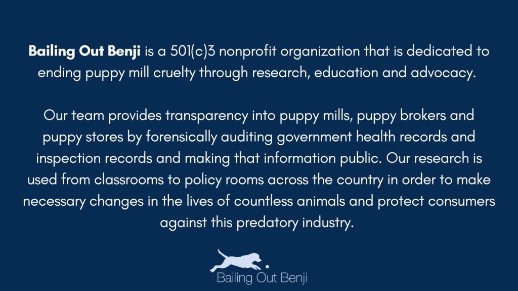 Before we begin, we want to acknowledge all of the hard work that advocates have done in order to pass legislation and ordinances in their communities! When we are relaying our research and our studies showing what has happened after the fact, it isn’t to denounce or dissuade people from working on this issue. Our research into the commercial dog breeding, pet store, sham rescue, and puppy mill world doesn’t stop once a law has been passed. We continue observing what happens after the laws go into effect, and we report the facts as we know them. When we know better, we do better- and at Bailing Out Benji, we are always striving to learn lessons and do better.