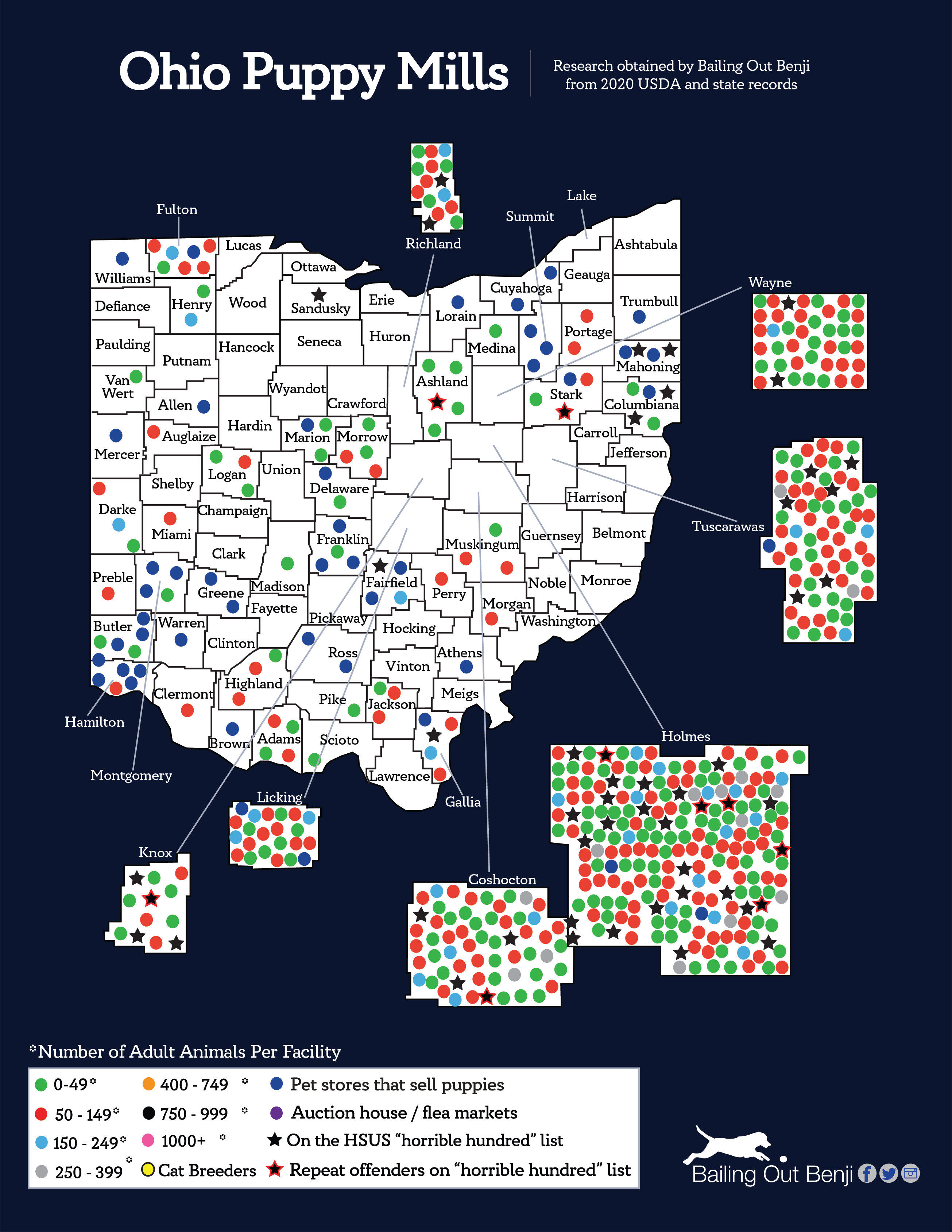 Volunteers from Bailing Out Benji devote their free time to researching puppy mills to create puppy mill maps for the worst states, as well as raise awareness about notorious pet stores and breeding operations with huge violations. This includes obtaining CVI data (Certificates of Veterinary Inspections) and making those reports public. To learn more about the puppy mills in your location, you can also go to our interactive website and search engine.