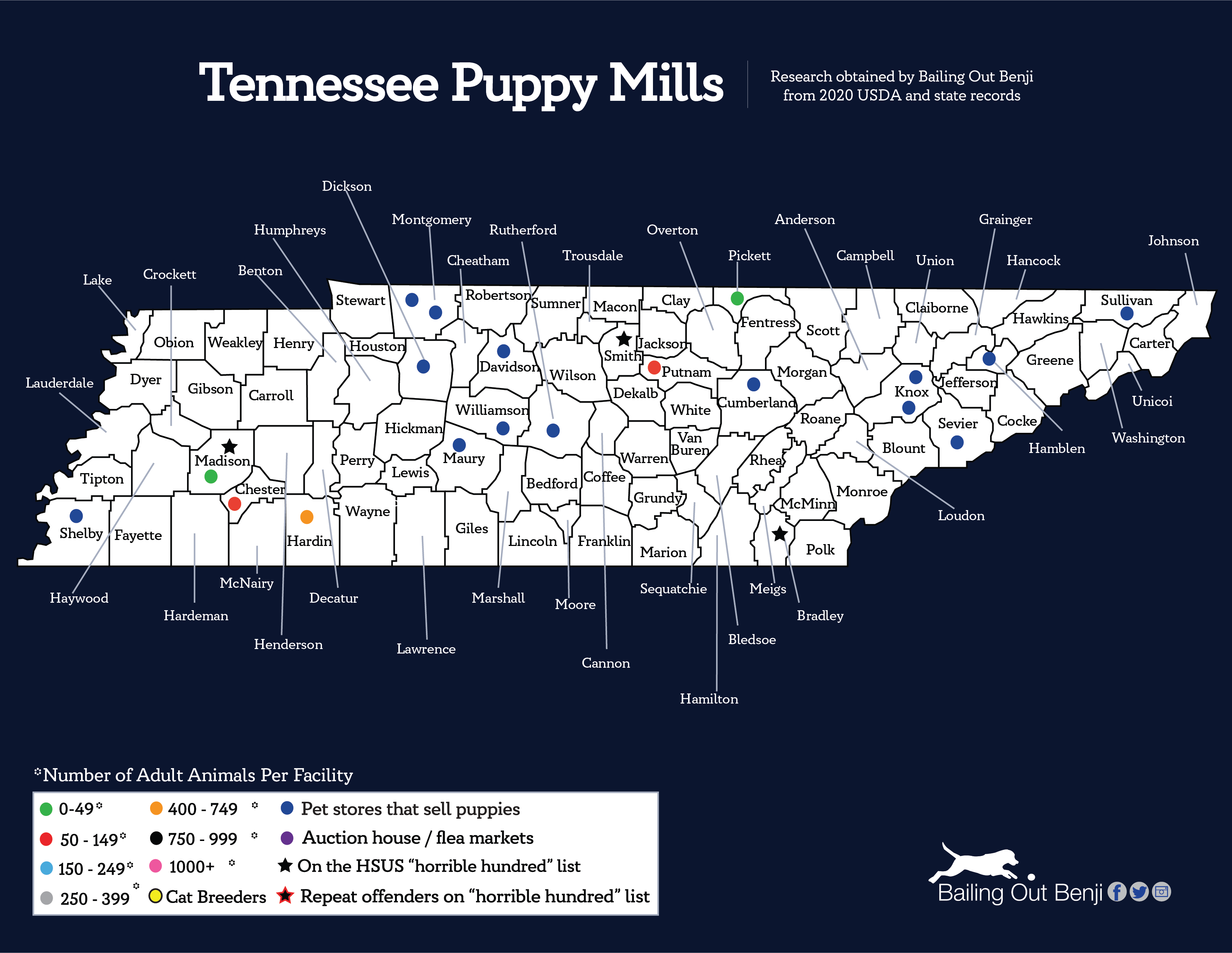 Volunteers from Bailing Out Benji devote their free time to researching puppy mills to create puppy mill maps for the worst states, as well as raise awareness about notorious pet stores and breeding operations with huge violations. This includes obtaining CVI data (Certificates of Veterinary Inspections) and making those reports public. To learn more about the puppy mills in your location, you can also go to our interactive website and search engine.