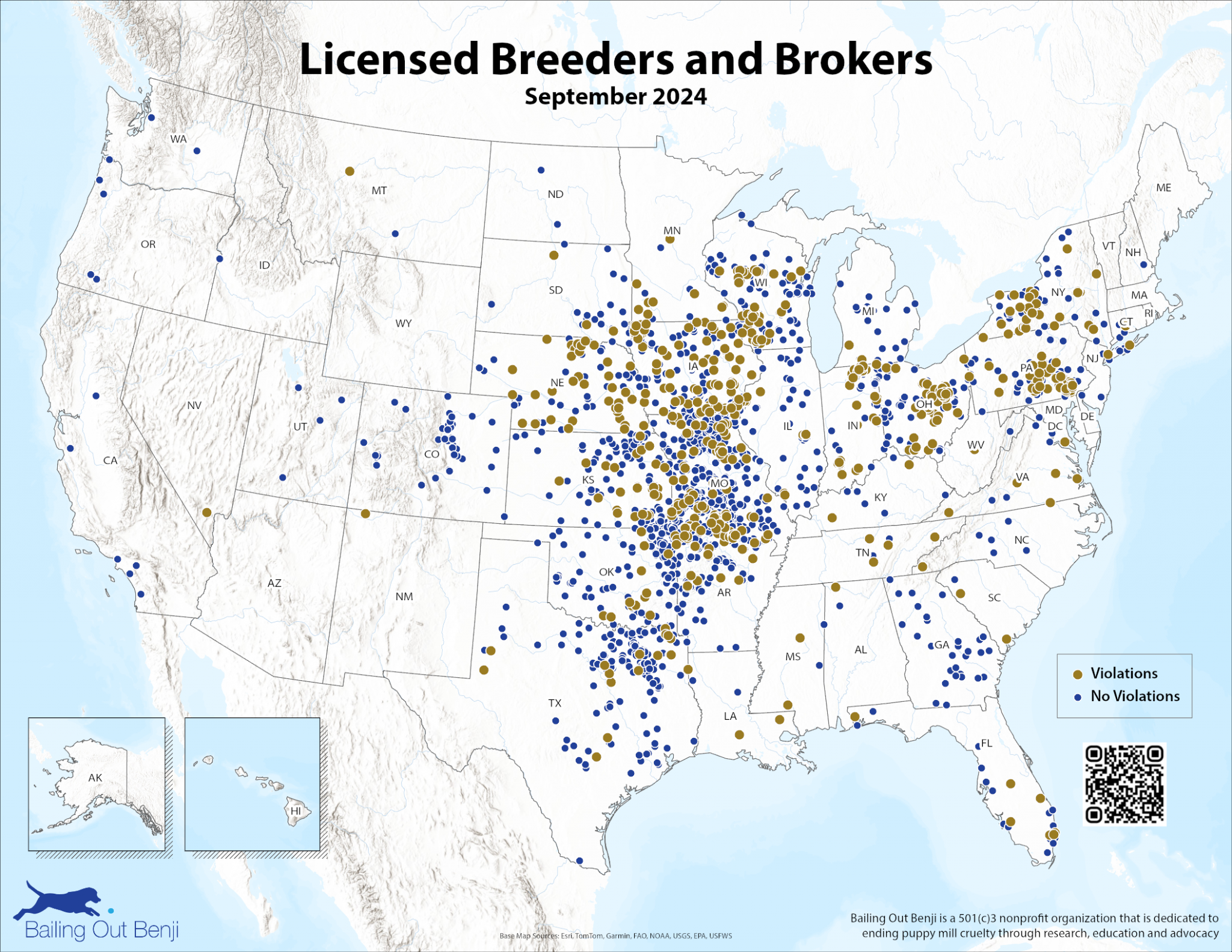 Now to get to the question of “which state is the worst when it comes to puppy mills”? That answer is harder than you might think to answer. Some might immediately jump and say Missouri because they have the highest volume of licensed dog breeders, while our organization might point to Wisconsin, who has the highest percentage of breeders with violations. Neither take into account states like Arkansas or Tennessee that have no state regulation.